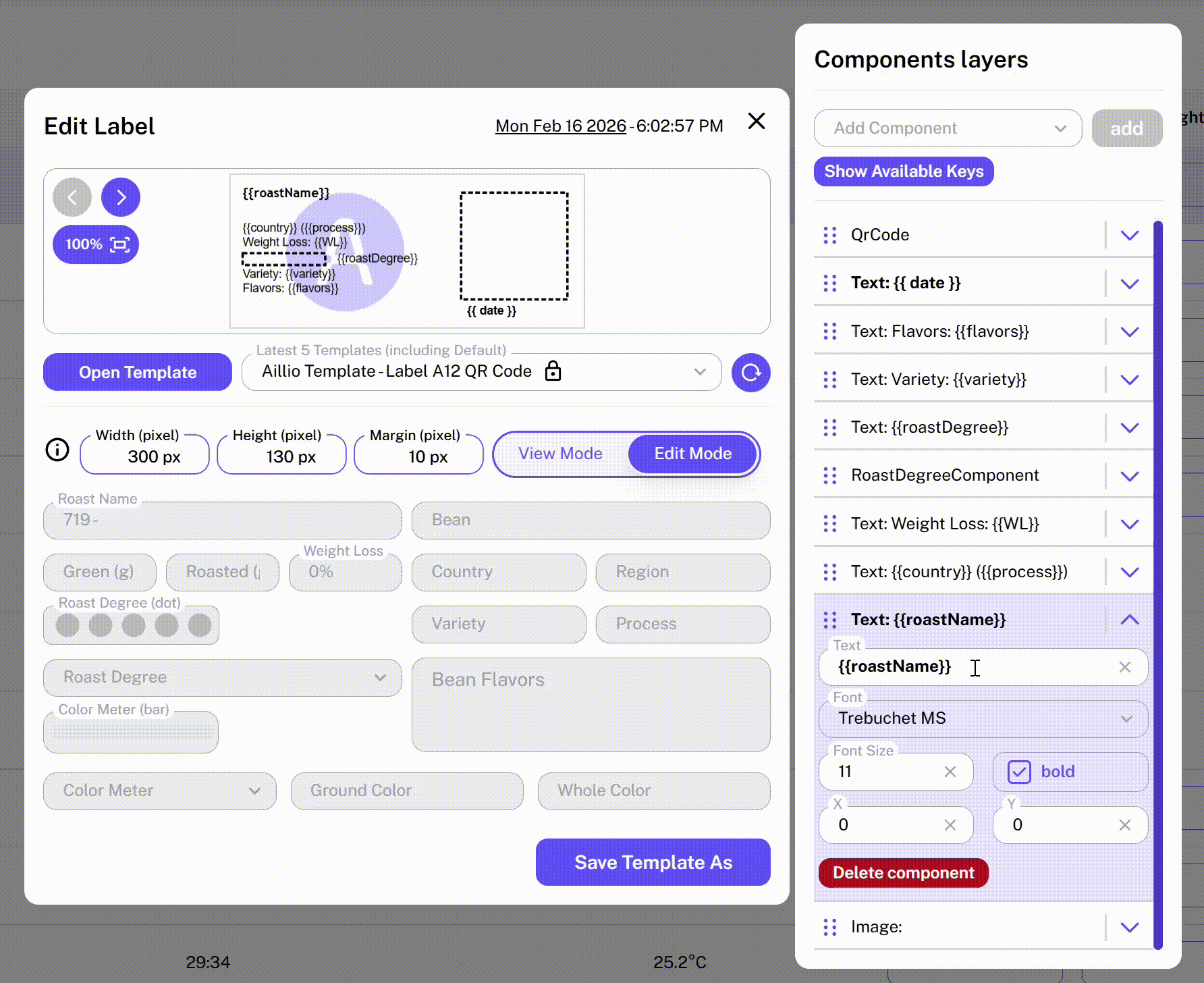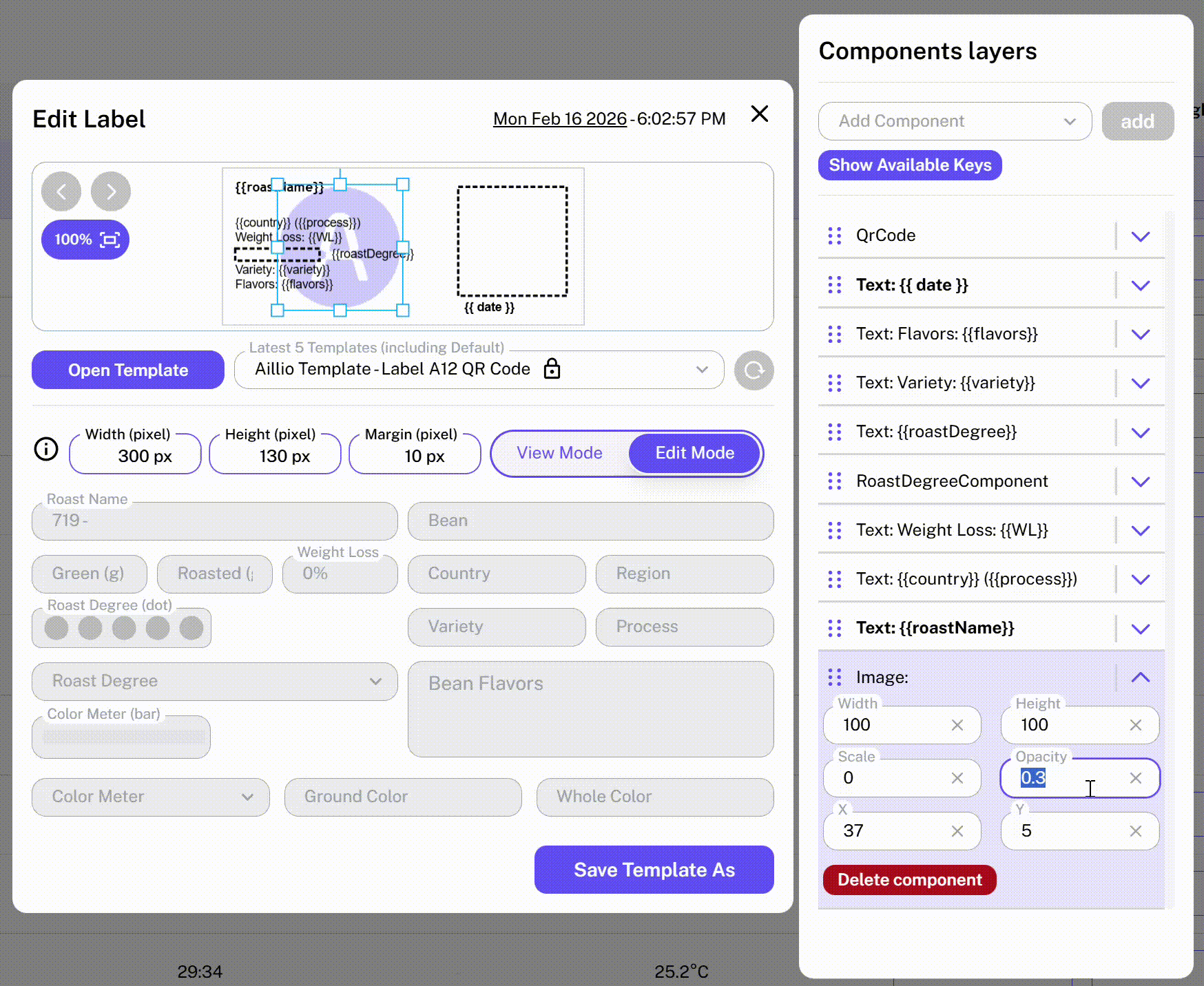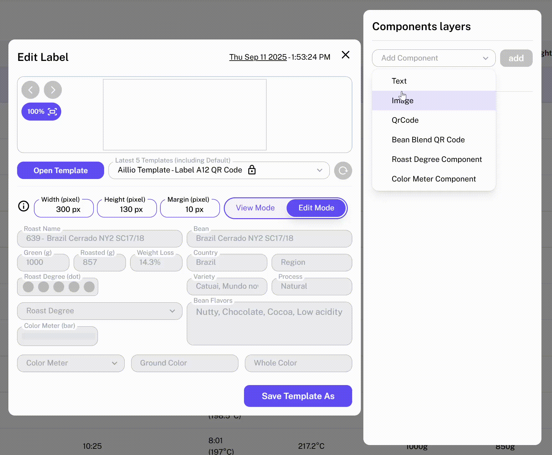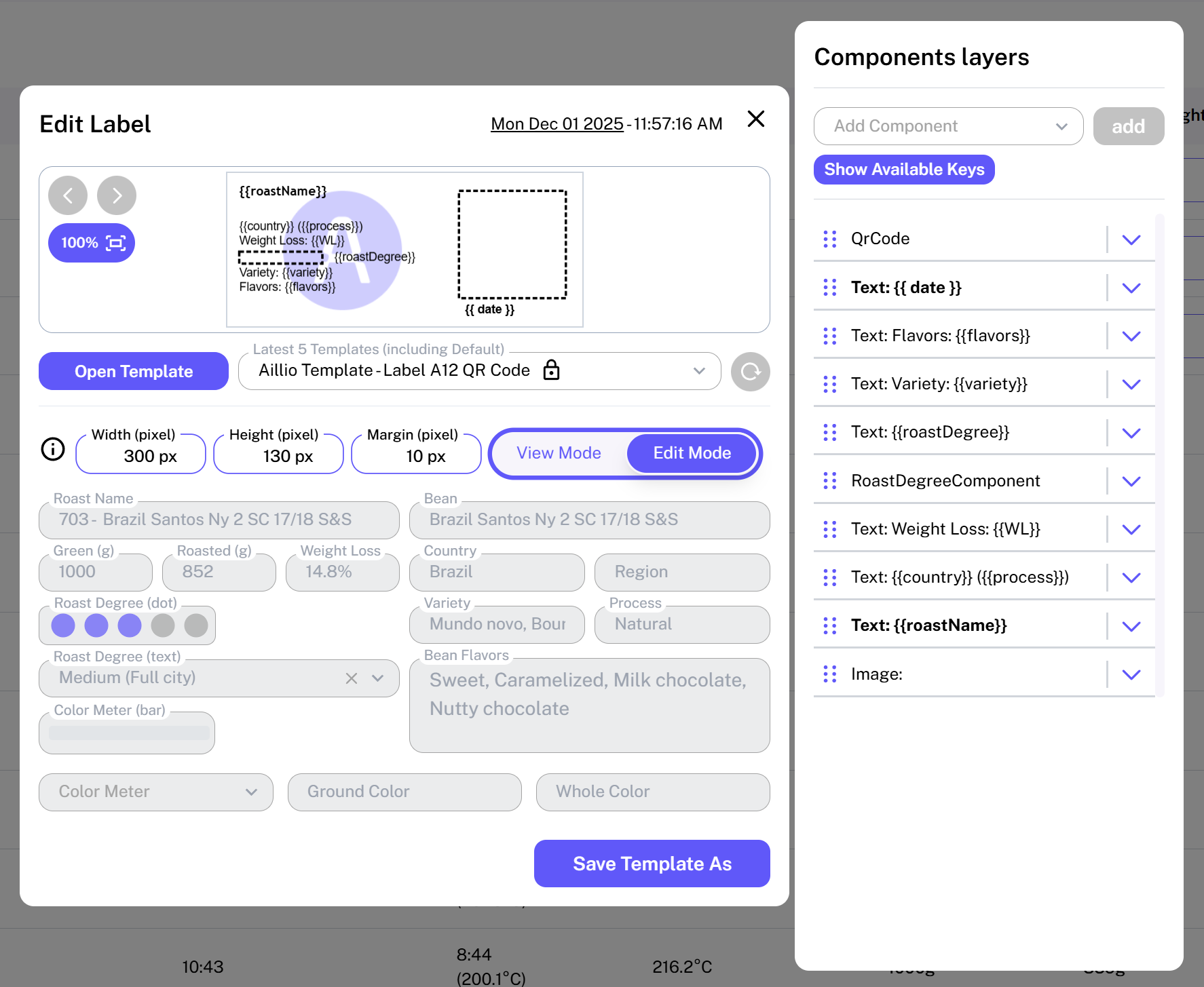 The Label Creator allows you to design and print custom labels for your Roast Profiles. It features a clean, minimalistic, and easy-to-use interface with two modes: View Mode and Edit Mode.