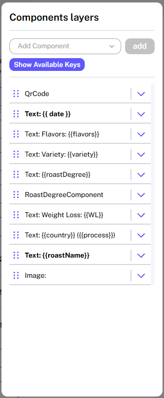 Reorder layers by dragging them up or down in the list. The top layer in the list is the frontmost on the label. Useful for ordering Images and Background.