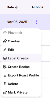 If you like the results of a particular Roast Profile and want to create a Roast Recipe from it, you can access this feature via the three-dot Actions Menu from any list view of the Roasts tab.