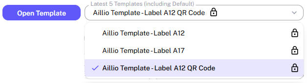 You can choose from default templates, open an existing JSON template, or create a new one. By default, the program loads your last-used template or defaults to Label Size A12 with QR code (79 x 34 mm / 3.11 x 1.34 inches).