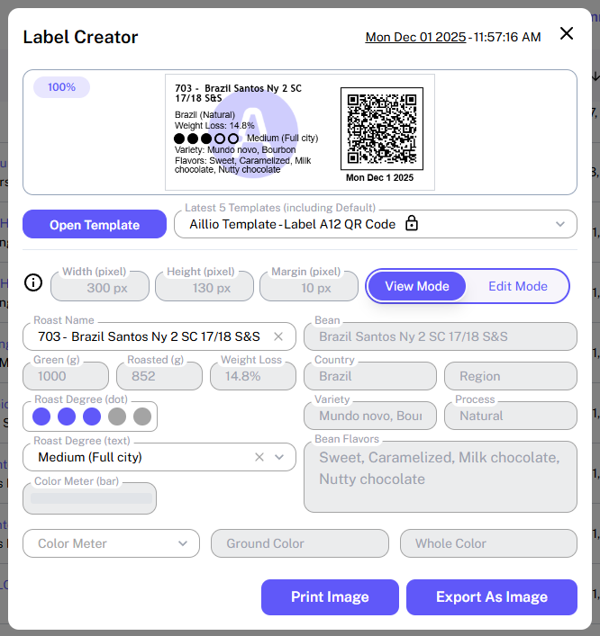 In View Mode, you can review your labels, print them directly, or export them as PNG images. This mode pulls roast profiles and bean details from Roast.World to automatically populate the label fields.